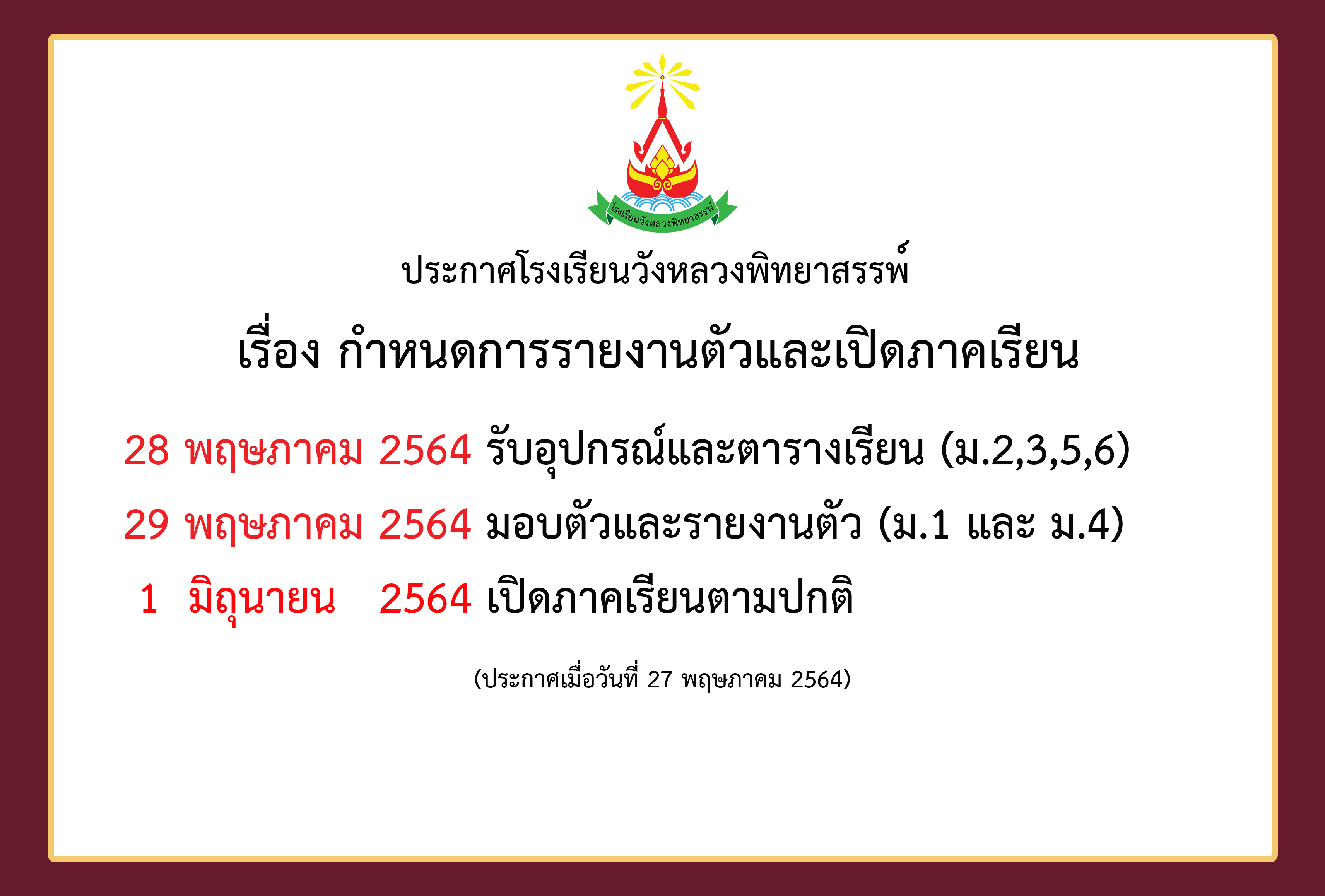1. วัน ศุกร์ ที่ 28 พฤษภาคม 2564 เวลา 9.00 น. เป็นต้นไป นักเรียนชั้น ม.2,3,5,6 ต้องสวมชุดพละสีแดงมารายงานตัว เนื่องจากในวันดังกล่าว จะมีกิจกรรม big cleaning day ห้องเรียนของนักเรียน และมีการมอบอุปกรณ์การเรียน โดยนักเรียนต้องเตรียมเอกสารดังต่อไปนี้