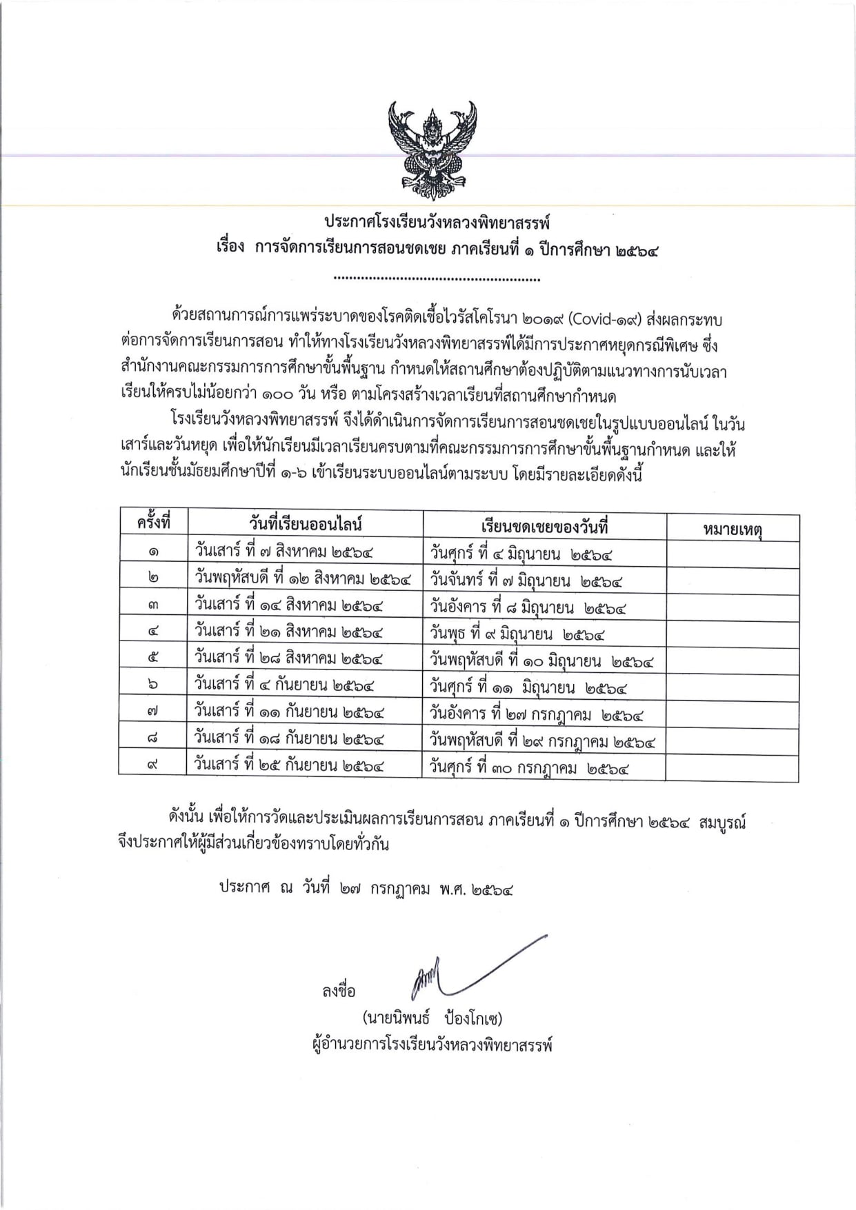 ประกาศกำหนดการการจัดการเรียนการสอนชดเชย ภาคเรียนที่ 1 ปีการศึกษา 2564