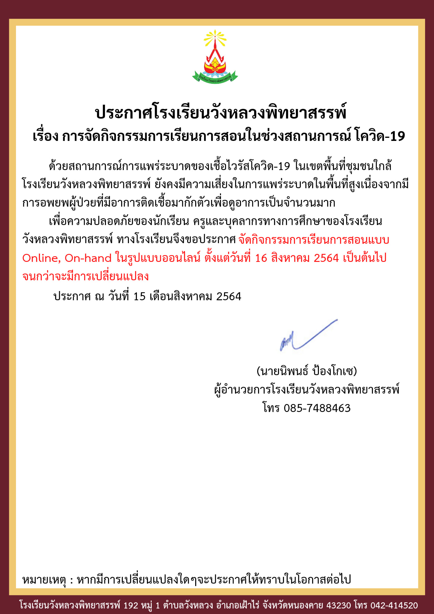เรื่อง การจัดกิจกรรมการเรียนการสอนในช่วงสถานการณ์ โควิด-19 (15 สิงหาคม 2564) ด้วยสถานการณ์การแพร่ระบาดของเชื้อไวรัสโควิด-19 ในเขตพื้นที่ชุมชนใกล้ โรงเรียนวังหลวงพิทยาสรรพ์ ยังคงมีความเสี่ยงในการแพร่ระบาดในพื้นที่สูง เนื่องจากมี การอพยพผู้ป่วยที่มีอาการติดเชื้อมากักตัวเพื่อดูอาการเป็นจำนวนมาก เพื่อความปลอดภัยของนักเรียน ครูและบุคลากรทางการศึกษาของโรงเรียนวังหลวงพิทยาสรรพ์ ทางโรงเรียนจึงขอประกาศ จัดกิจกรรมการเรียนการสอนแบบ On line, On-hand ตั้งแต่วันที่ 16 สิงหาคม 2564 เป็นต้นไปจนกว่าจะมีประกาศเปลี่ยนแปลง -------------------------------------- หมายเหตุ : หากมีการเปลี่ยนแปลงใดๆจะประกาศให้ทราบในโอกาสต่อไป |