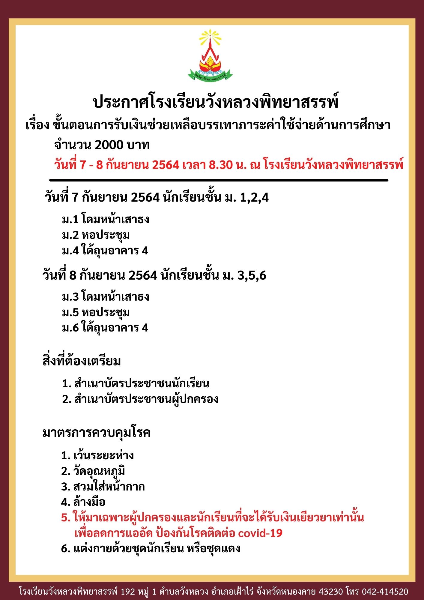 5. ให้มาเฉพาะผู้ปกครองและนักเรียนที่จะได้รับเงินเยียวยาเท่านั้น เพื่อลดการแออัด ป้องกันโรคติดต่อ covid-19