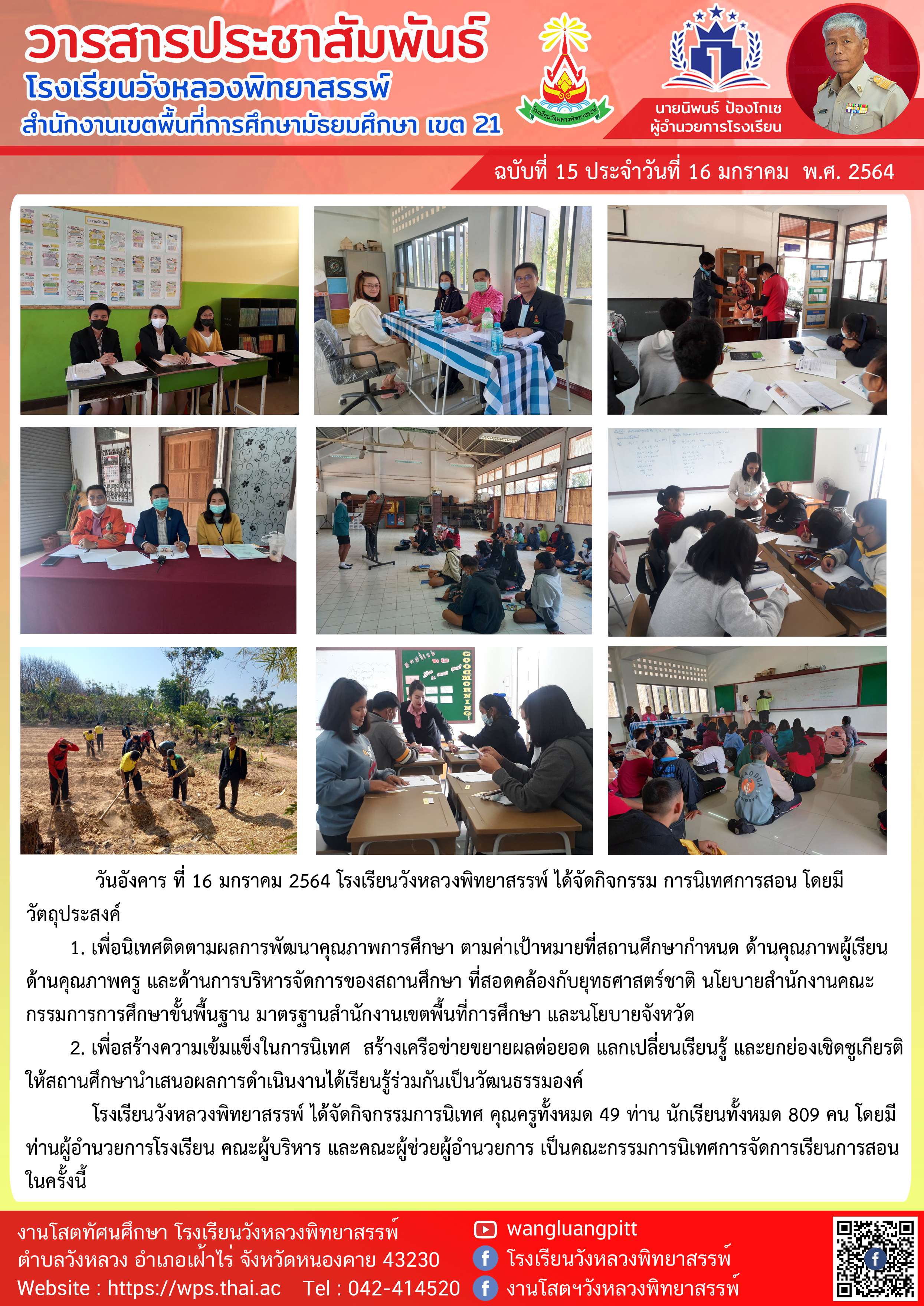 วันอังคาร ที่ 16 มกราคม 2564 โรงเรียนวังหลวงพิทยาสรรพ์ ได้จัดกิจกรรม การนิเทศการสอน โดยมีวัตถุประสงค์ 1. เพื่อนิเทศติดตามผลการพัฒนาคุณภาพการศึกษา ตามค่าเป้าหมายที่สถานศึกษากำหนด ด้านคุณภาพผู้เรียน ด้านคุณภาพครู และด้านการบริหารจัดการของสถานศึกษา ที่สอดคล้องกับยุทธศาสตร์ชาติ นโยบายสำนักงานคณะกรรมการการศึกษาขั้นพื้นฐาน มาตรฐานสำนักงานเขตพื้นที่การศึกษา และนโยบายจังหวัด 2. เพื่อสร้างความเข้มแข็งในการนิเทศ สร้างเครือข่ายขยายผลต่อยอด แลกเปลี่ยนเรียนรู้ และยกย่องเชิดชูเกียรติ ให้สถานศึกษานำเสนอผลการดำเนินงานได้เรียนรู้ร่วมกันเป็นวัฒนธรรมองค์