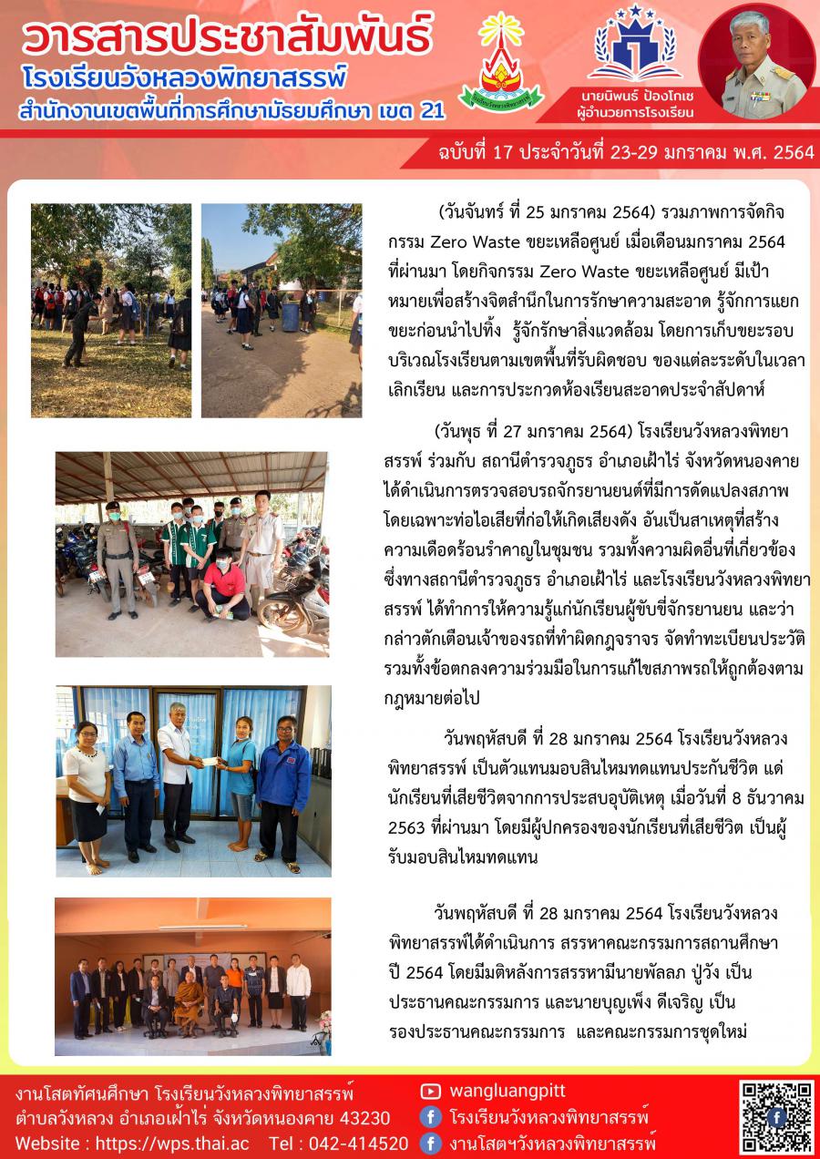 วันพฤหัสบดี ที่ 28 มกราคม 2564 โรงเรียนวังหลวงพิทยาสรรพ์ เป็นตัวแทนมอบสินไหมทดแทนประกันชีวิต แก่นักเรียนที่เสียชีวิตจากการประสบอุบัติเหตุ เมื่อวันที่ 8 ธันวาคม 2563 ที่ผ่านมา โดยมีผู้ปกครองของนักเรียนที่เสียชีวิต เป็นผู้รับมอบสินไหมทดแทน