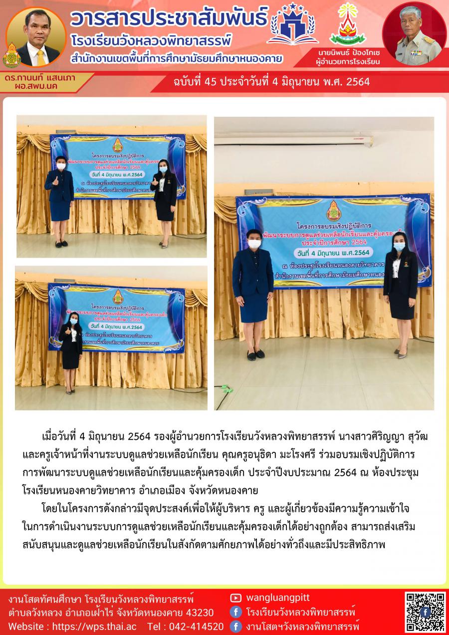 เมื่อวันที่ 4 มิถุนายน 2564 รองผู้อำนวยการโรงเรียนวังหลวงพิทยาสรรพ์ นางสาวศิริญญา สุวัฒ และครูเจ้าหน้าที่งานระบบดูแลช่วยเหลือนักเรียน คุณครูอนุธิดา มะโรงศรี ร่วมอบรมเชิงปฏิบัติการการพัฒนาระบบดูแลช่วยเหลือนักเรียนและคุ้มครองเด็ก ประจำปีงบประมาณ 2564 ณ ห้องประชุมโรงเรียนหนองคายวิทยาคาร อำเภอเมือง จังหวัดหนองคาย