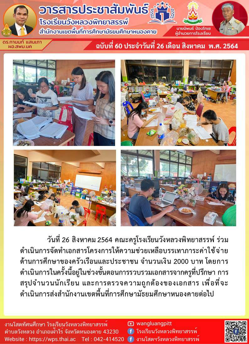 วันที่ 26 สิงหาคม 2564 คณะครูโรงเรียนวังหลวงพิทยาสรรพ์ ร่วมดำเนินการจัดทำเอกสารโครงการให้ความช่วยเหลือบรรเทาภาระค่าใช้จ่ายด้านการศึกษาของครัวเรือนและประชาชน จำนวนเงิน 2000 บาท โดยการดำเนินการในครั้งนี้อยู่ในช่วงขั้นตอนการรวบรวมเอกสารจากครูที่ปรึกษา การสรุปจำนวนนักเรียน และการตรวจความถูกต้องของเอกสาร เพื่อที่จะดำเนินการส่งสำนักงานเขตพื้นที่การศึกษามัธยมศึกษาหนองคายต่อไป