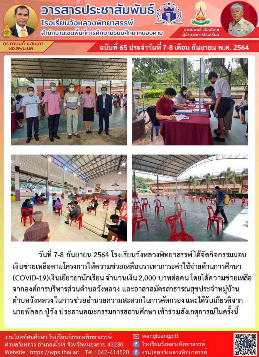 วันที่ 7-8 กันยายน 2564 โรงเรียนวังหลวงพิทยาสรรพ์ ได้จัดกิจกรรมมอบเงินช่วยเหลือตามโครงการให้ความช่วยเหลือบรรเทาภาระค่าใช้จ่ายด้านการศึกษา (COVID-19)เงินเยียวยานักเรียน จำนวนเงิน 2,000 บาทต่อคน โดยได้ความช่วยเหลือจากองค์การบริหารส่วนตำบลวังหลวง และอาสาสมัครสาธารณสุขประจำหมู่บ้านตำบลวังหลวง ในการช่วยอำนวยความสะดวกในการคัดกรอง และได้รับเกียรติจาก นายพัลลภ ปู่วัง ประธานคณะกรรมการสถานศึกษา เข้าร่วมสังเกตุการณ์ในครั้งนี้