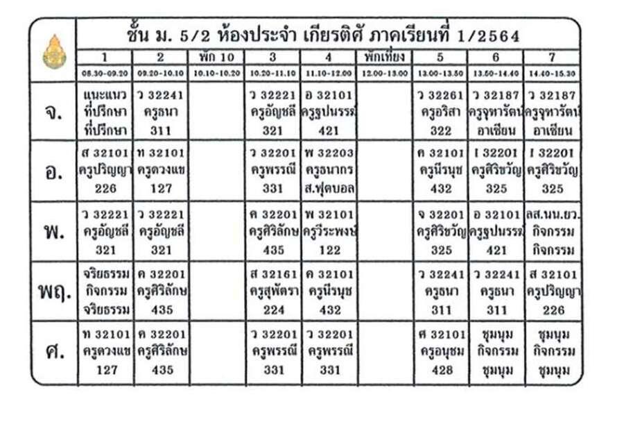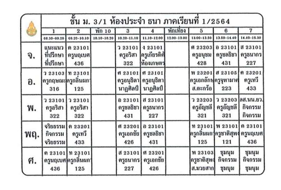 ตารางเรียน ภาคเรียนที่ 1 ประจำปีการศึกษา 2564