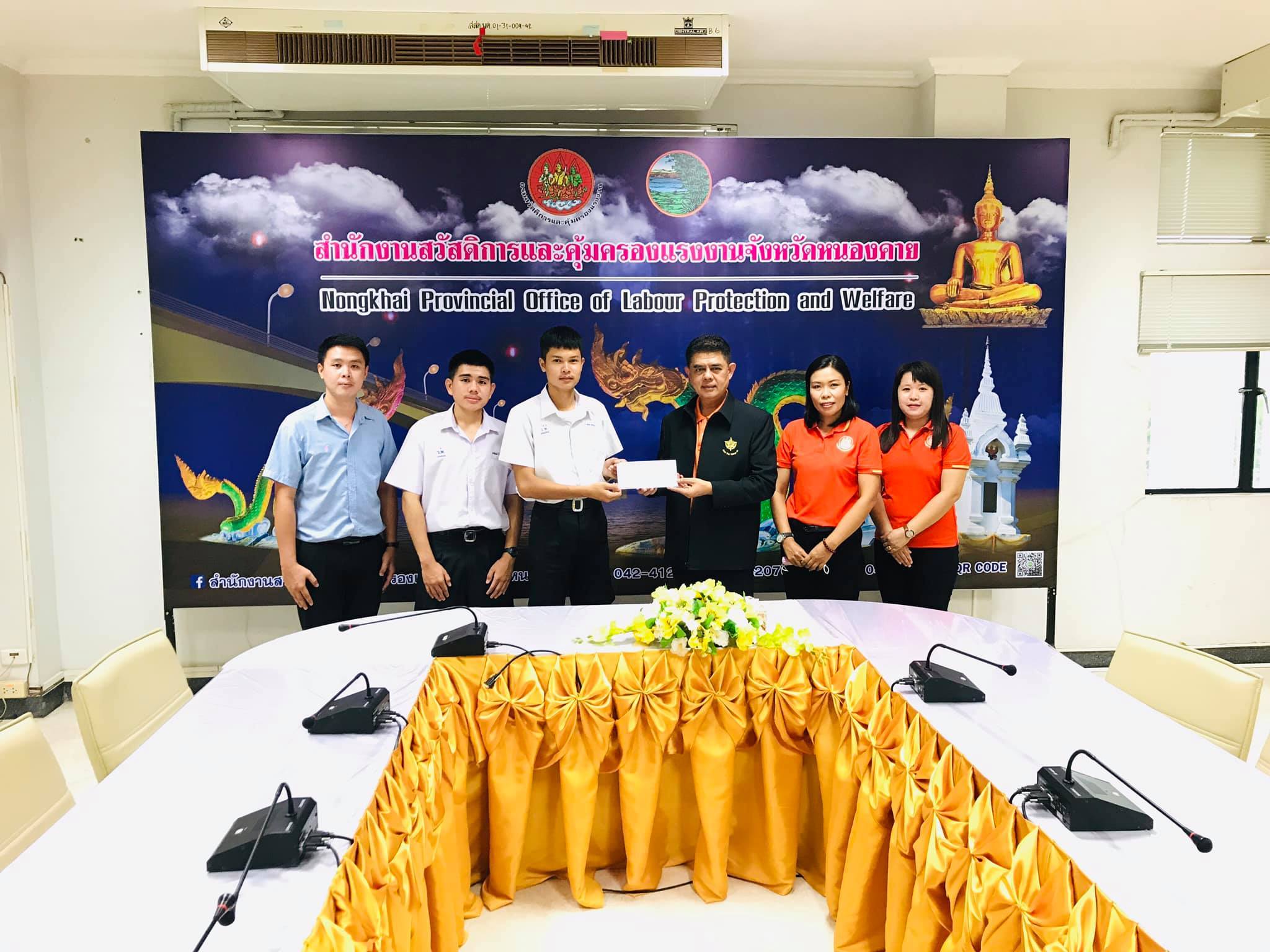 คุณครูธนากร จันดา และตัวแทนคณะนักเรียน รับรางวัลชนะเลิศ "หนังสั้นการป้องกันและแก้ไขปัญหายาเสพติดในสถานประกอบกิจการ"