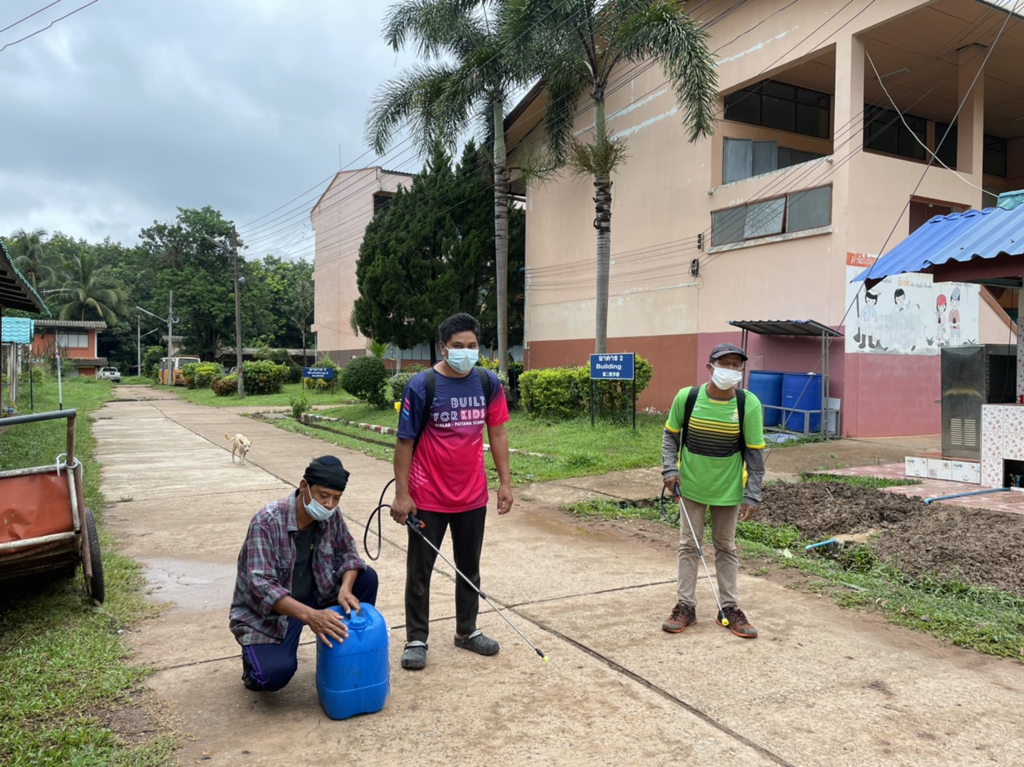 คณะนักการภารโรงโรงเรียนวังหลวงพิทยาสรรพ์ฉีดพ่นยาฆ่าเชื้อภายในอาคารรเรียน